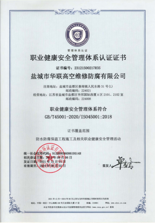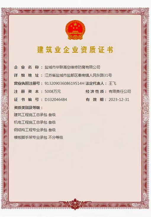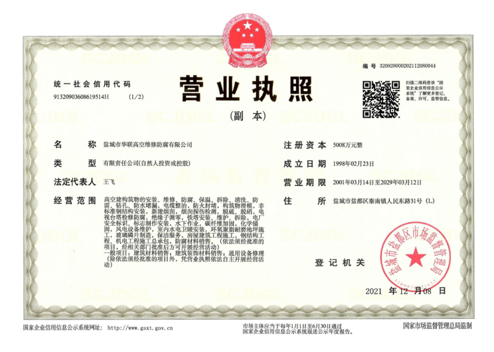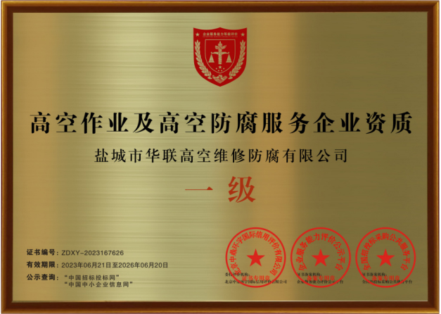 鹽城市華聯(lián)高空維修防腐有限公司始建于上世紀(jì)八十年代,系專(zhuān)業(yè)從事風(fēng)力發(fā)電機(jī)塔筒防腐,塔筒維護(hù),塔筒補(bǔ)漆,塔筒噴字等工程。不停產(chǎn),不搭手架,高空懸吊施工的一級(jí)高空安全資質(zhì)、一級(jí)高空防腐施工資質(zhì)、二級(jí)建筑施工資質(zhì)的高空建修、防腐工程、公司。現(xiàn)已發(fā)展集科研、設(shè)計(jì)、施工為一體的的江蘇省較大的高空建修,高空防腐施工企業(yè);公司注冊(cè)資金3008萬(wàn)元,流動(dòng)資金8000多萬(wàn)元;擁有高修技術(shù)科研高修工程設(shè)計(jì)、高修工程施工三大技術(shù)與施工組織體系;公司擁有一流的技術(shù)施工隊(duì)伍,其中有高級(jí)職稱(chēng)36 名,中級(jí)職稱(chēng)126人。具備一級(jí)防腐資質(zhì)、一級(jí)安全資質(zhì)及二級(jí)建筑資質(zhì),公司下轄五個(gè)分公司和十八個(gè)辦事處,為全國(guó)數(shù)百家企業(yè)解決了若干“高、大、難”的特殊工程項(xiàng)目,填補(bǔ)了我國(guó)建筑史上的空白。
